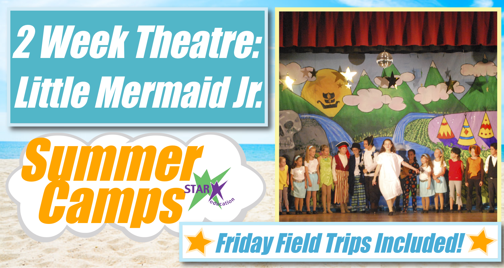 Make a splash this summer with STAR’s Little Mermaid Jr. musical theatre camp, perfect for young performers who love to act, sing, move, and let their imaginations soar! Over two fun-filled weeks, campers journey “under the sea” as they rehearse and bring to life the beloved tale of Ariel, a curious mermaid who dreams of exploring the human world. Filled with unforgettable characters, catchy songs, and ocean-bright energy, this camp is the ideal way for kids with the acting bug to shine. Campers will rotate through singing, acting, choreography, and helping with simple set pieces, or creating costume accessories. Guided by experienced teaching artists, students build confidence, teamwork, and performance skills in a warm, encouraging environment. The camp culminates in a joyful final performance. Spots fill quickly so don’t miss your chance to give your child a truly magical summer experience!