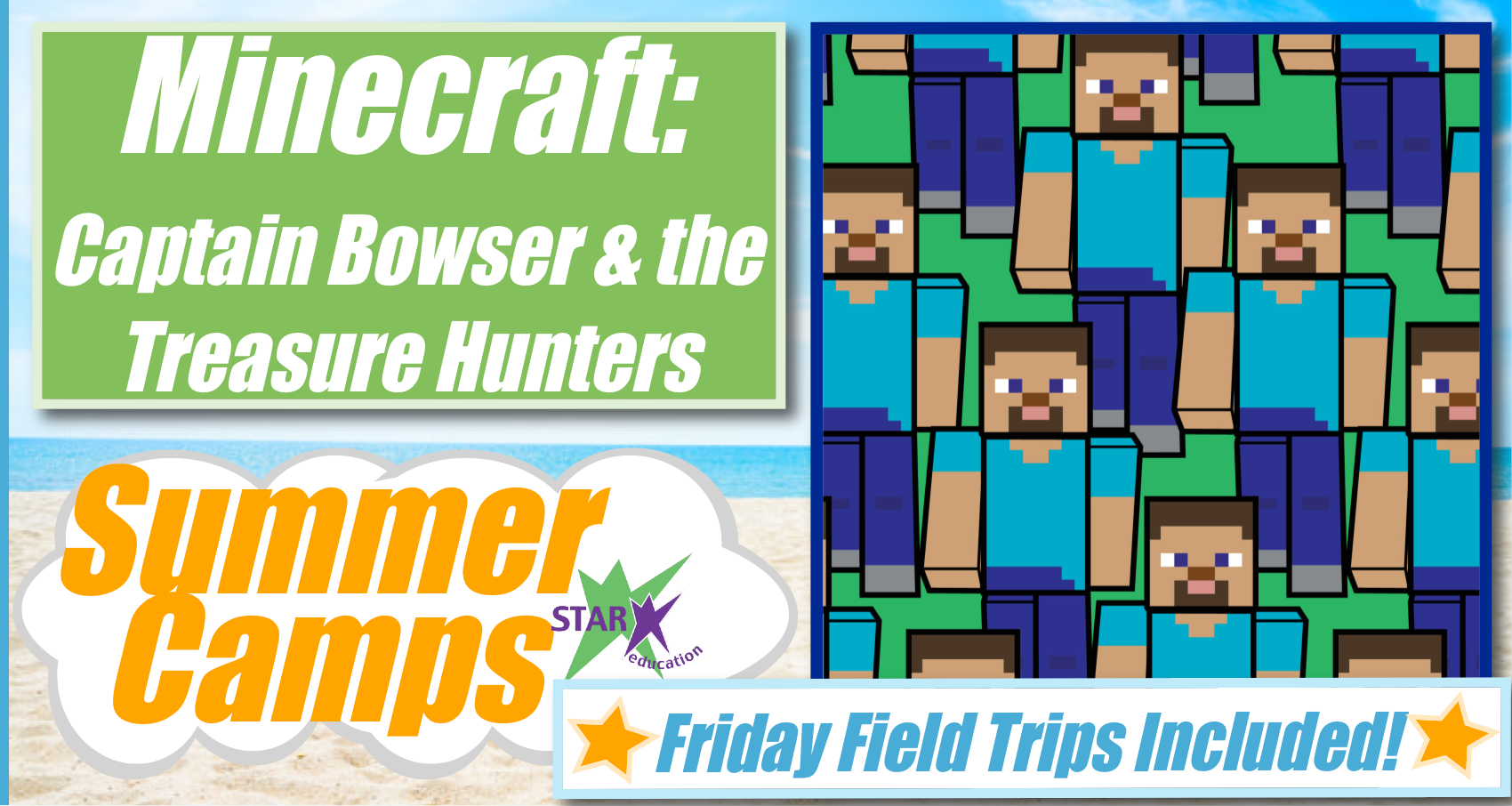 Ahoy, mateys! Set sail on a story-driven Minecraft adventure where every camper becomes a treasure hunter exploring a vast chain of mysterious islands. Claim your own resource-rich island and transform it into a mighty pirate stronghold with harbors, treasure vaults, lookout towers, and clever defenses. But no pirate conquers the seas alone—trade rare items, negotiate alliances, and collaborate on massive builds like shared ports or a grand Pirate Republic. Campers will strategize, engineer, explore, and navigate both danger and diplomacy as they shape the future of the archipelago. The week finishes with a showcase of each captain’s island followed by an “epic” pirate battle on the high seas. Ready your ships and sharpen your wits–Captain Bowser awaits bold Treasure Hunters!